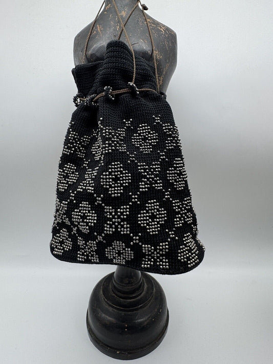 1920s Black Purse Steel Beads Crochet Satin Liner Draw String ESTATE FIND