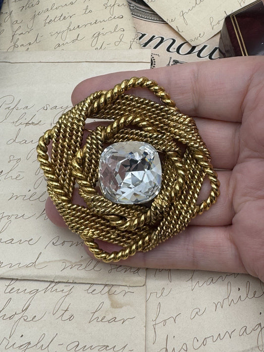 Large Vintage Goldtone Knotted Rope Brooch Clear Center Rhinestone