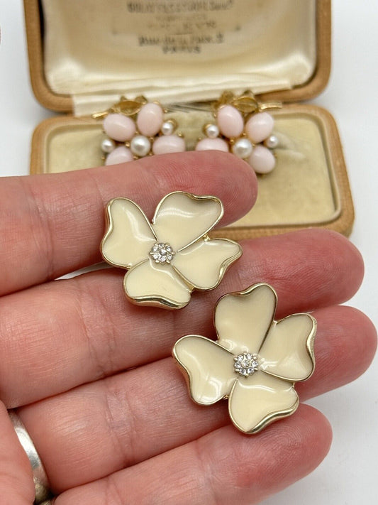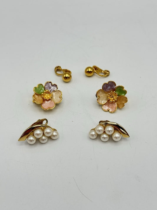 2 Pair Of Vintage Goldtone Flower Design Costume Clip-on Earrings