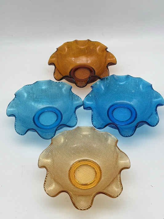 4 Vintage Glass Bowls Italian Style Ruffled Waffle Iridescent Blue Honey Amber