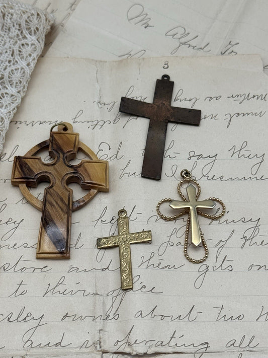 4 Vintage Cross Pendants LOT Wood Copper & Other