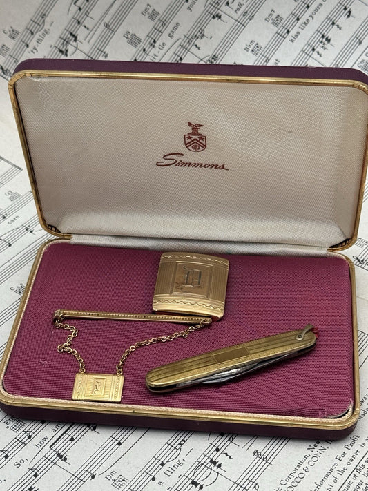 VINTAGE Gentlemen’s Belt Buckle Tie Clip Set In Case Monogram D Goldtone