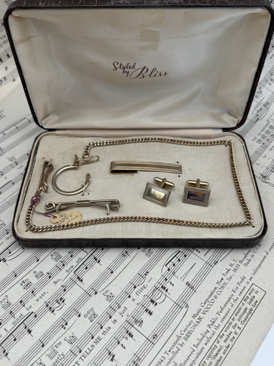 Vintage Gentlemen Case Goldtone Watch Chain Cufflinks Tie Bar Collar Stays Case