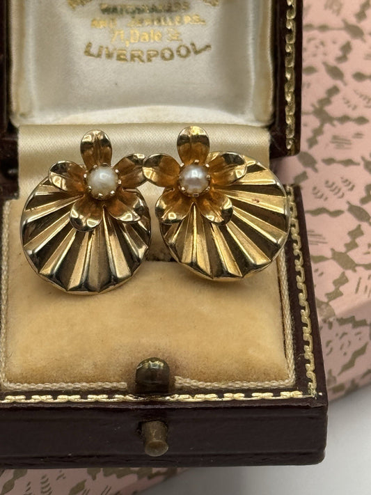 Vintage Goldtone Screw back Earrings Faux Pearl Flower Design