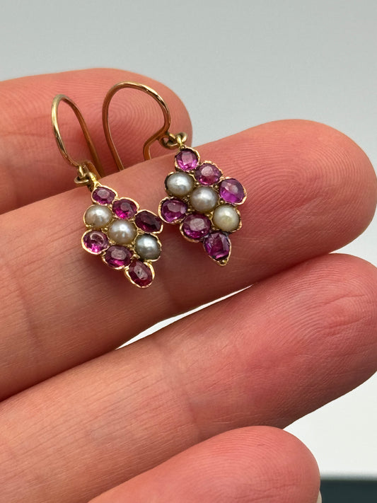 Antique 14K Gold Ruby & Pearl Cluster Earrings – Victorian Grape Motif – Appraised $1,100
