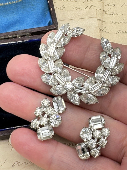 Vintage Laurel Wreath Brooch & Earrings Clear Rhinestone Brooch Made In Austria