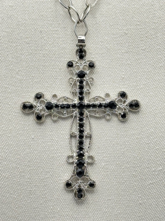Vintage Large Cross Black Rhinestone 60” Silvertone Chain Necklace ESTATE FIND