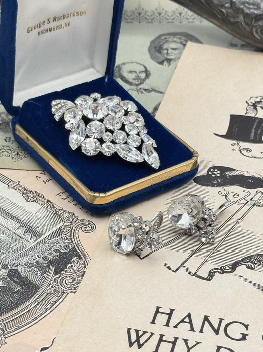 Vintage Rhinestone Demi Parure Set Clear Rhinestone Earrings & Brooch
