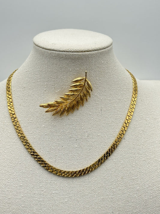 Vintage REVERSIBLE Goldtone Flat Link Necklace 18” & Leaf Brooch Set
