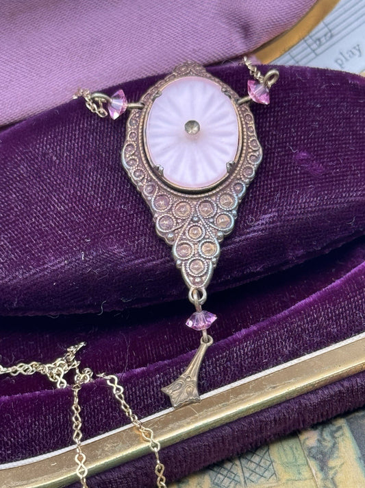 Vintage Pink Camphor Glass Pendant Necklace 20” Copper Goldtone