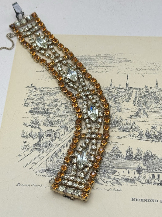 VINTAGE Rhinestone Bracelet AMBER ORANGE Pale Yellow 7”x1” OPENWORK Statement