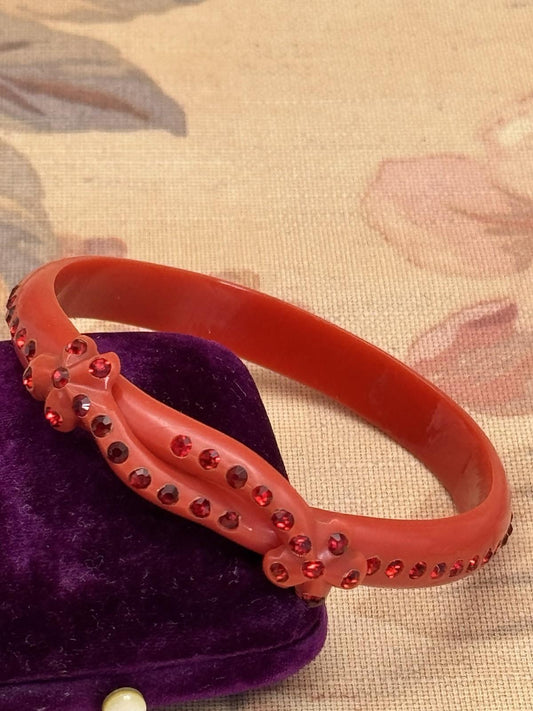 Vintage Red Celluloid Rhinestone Bangle Bracelet – 8” Diameter, .43” Wide