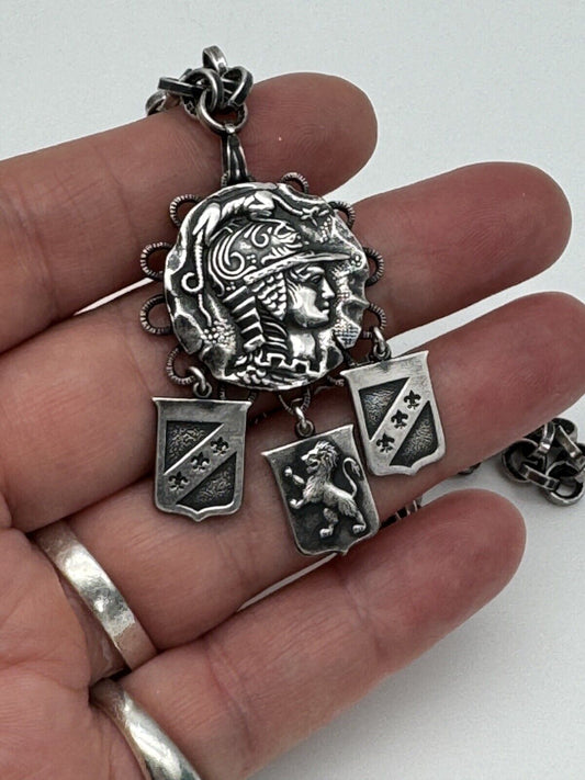 Vintage Silver Tone Roman Soldier Coin Style Dragon Helmet Pendant Necklace