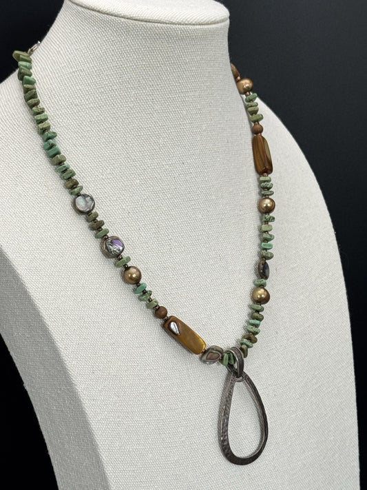 Vintage SILPADA Hammered Silver Pendant Green & Broen Beads ESTATE FIND Ca.20”