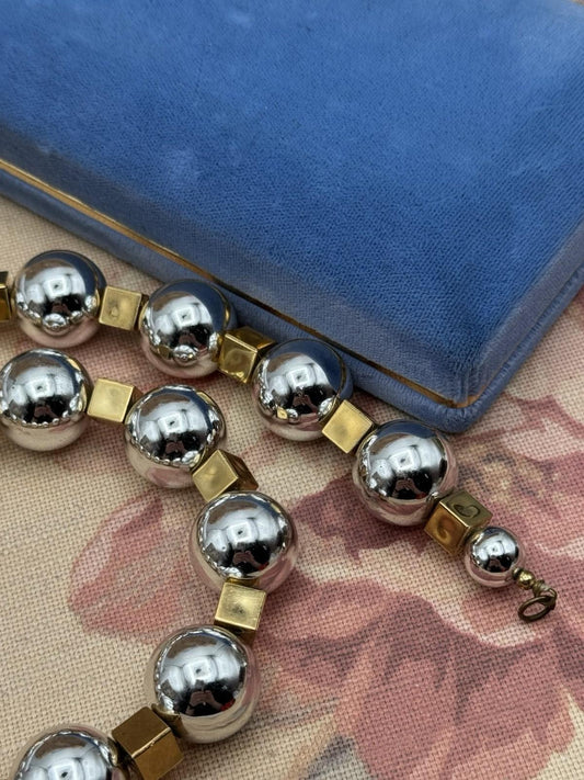 Vintage Silver Tone Plastic Bead Necklace 17” with Gold Cube Spacers Retro