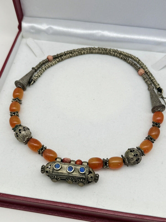 Vintage Tribal Style ARTISAN Crafted Necklace Silvertone Orange Beads 25”