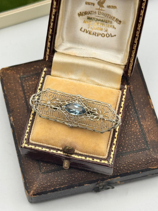 ANTIQUE Art Deco Brooch 10K White Gold Filigree Blue Topaz Bar Pin