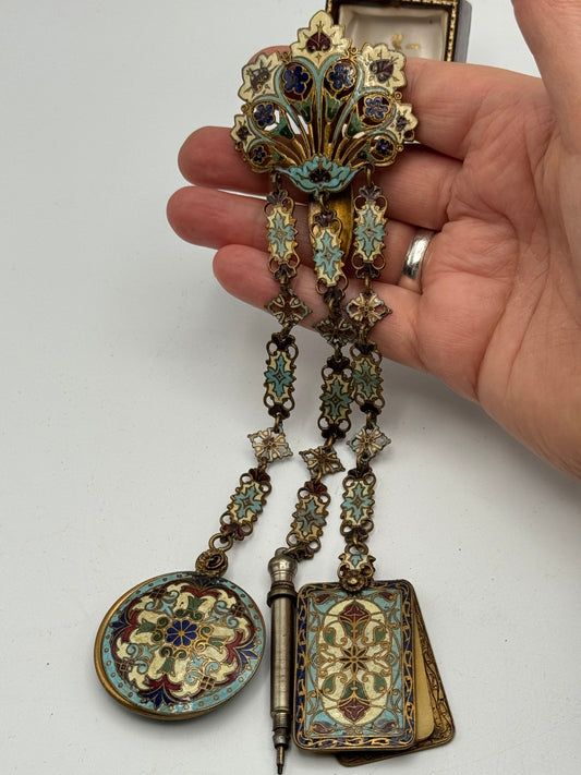Antique Art Nouveau Enameled Aide-Mémoire Vanity Chatelaine with Mirror, Pencil & Notebook