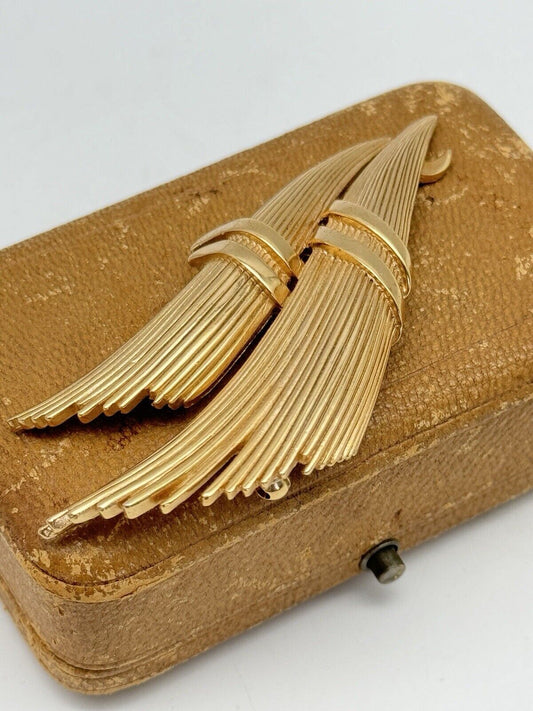 Vtg Original Tag Signed TRIFARI CROWN Gold tone Brushed SHEAF Shape Pin Brooch