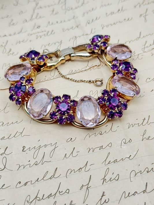 VTG Juliana Bracelet 5 Link Purple Pink Rhinestone Flower Verified #1310