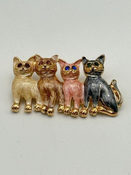 Vtg Enamel Four Cat Brooch Green Blue Brown Crystal Eyes Kitty Pin
