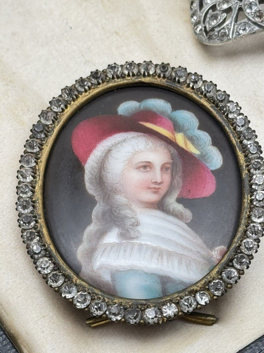 Antique French Style Miniature Lady With Hat In Brass Oval Frame Rhinestones