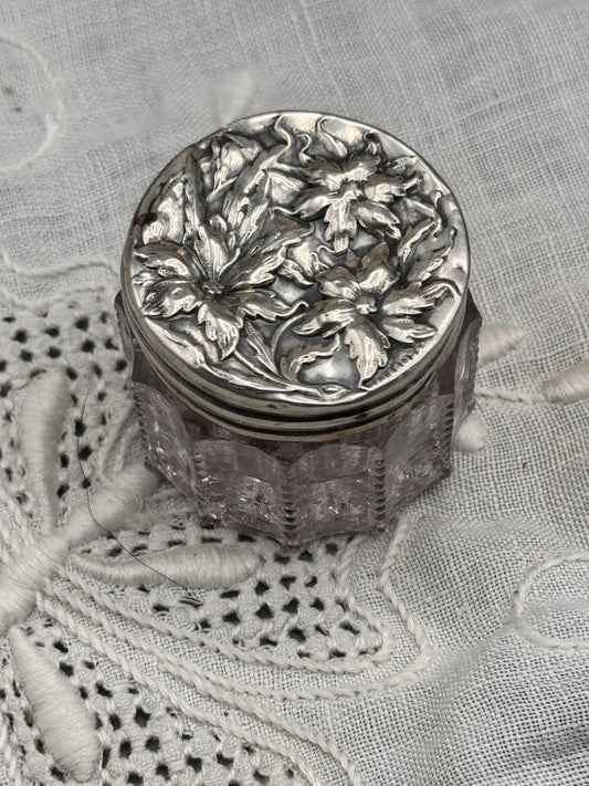 Vintage Pale Violet Glass Dresser Jar STERLING Silver Floral Lid 1.5 in