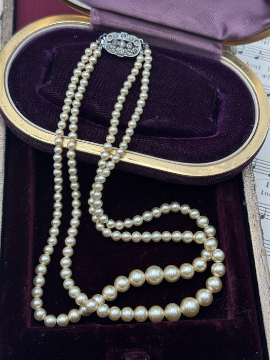 Vintage ART DECO Signed Marvella Faux Pearl Necklace Double Strand Goldtone 14.5”