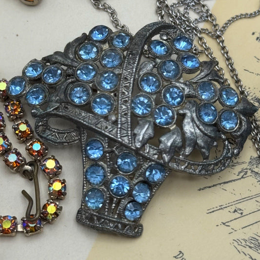 Vintage Brooch LARGE Pot Metal Basket Piercing Blue Brooch 2.28”