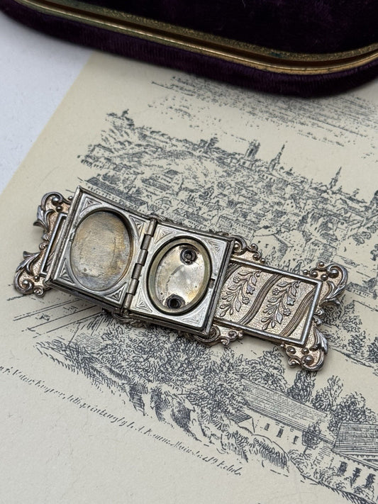 Antique Victorian Style Mourning Brooch Locket Black Glass Cameo Goldtone 3”