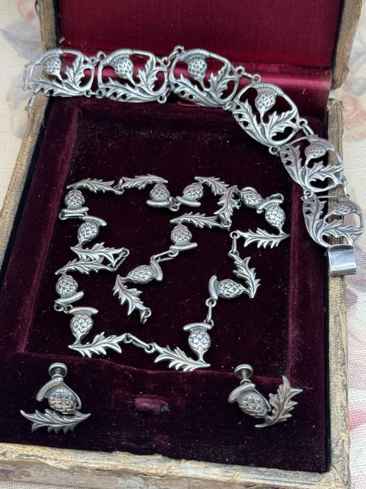 Sterling Silver Scottish Thistle Parure Necklace Bracelet Earrings c1930s