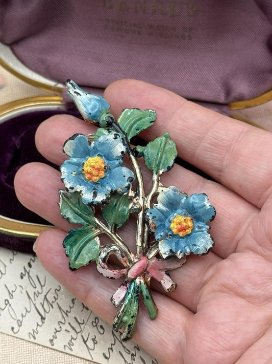 VINTAGE “Celluloid” Floral Brooch Blue Flowers Pink Bow Enamel Painted 3.5” 1920s