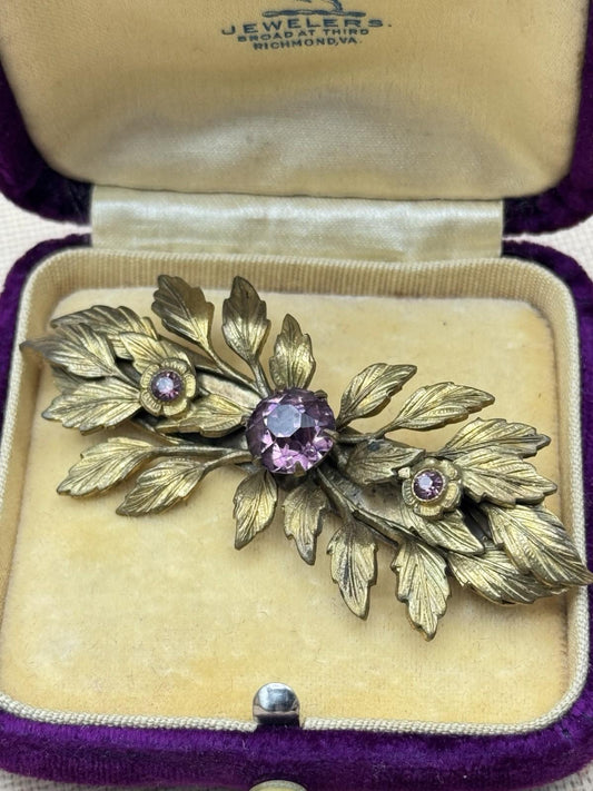 Antique Gilt Brooch Purple Glass Floral Bar Pin 2.25” x 1”