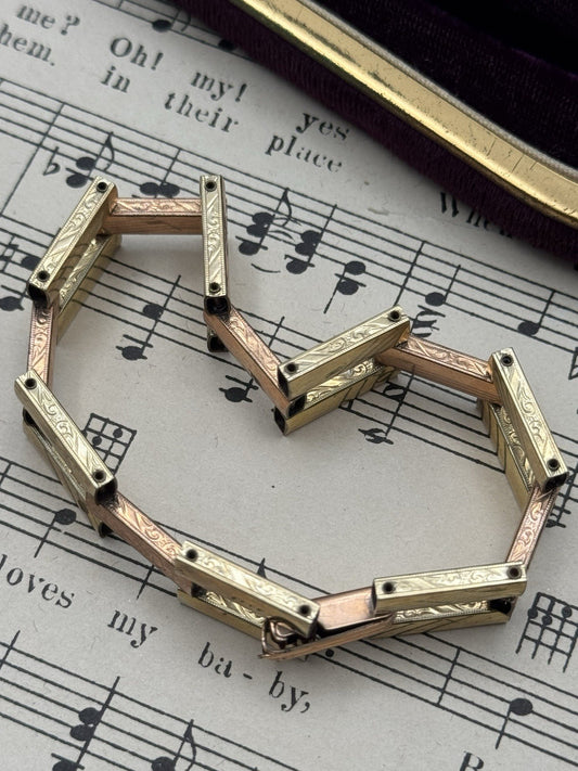 Antique 1915 Friendship Bracelet Gold Filled Rose Gold Engraved Panels 6.25”