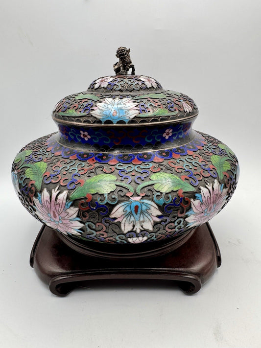 Large Cloisonné Lidded Bowl / Jar With Wood Stand Foo Dog Finial READ‼️