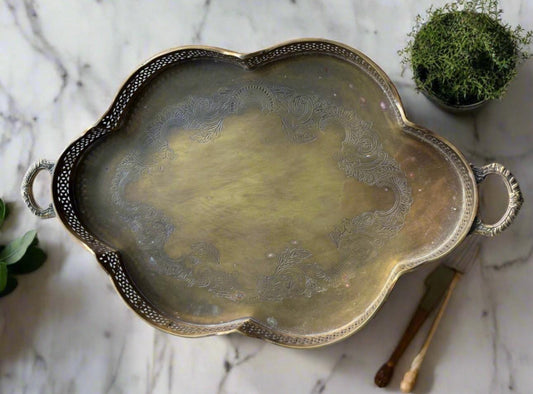 Vintage Tray Footed Gallery Brass AGED Handles Ornate Engraved Serving Tray 23” by 13.75”
