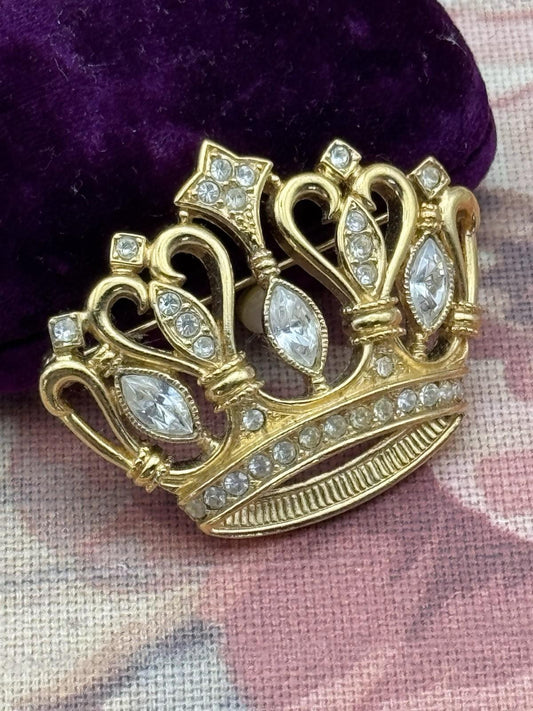 KJL for Avon Crown Brooch Goldtone Rhinestone Signed Vintage