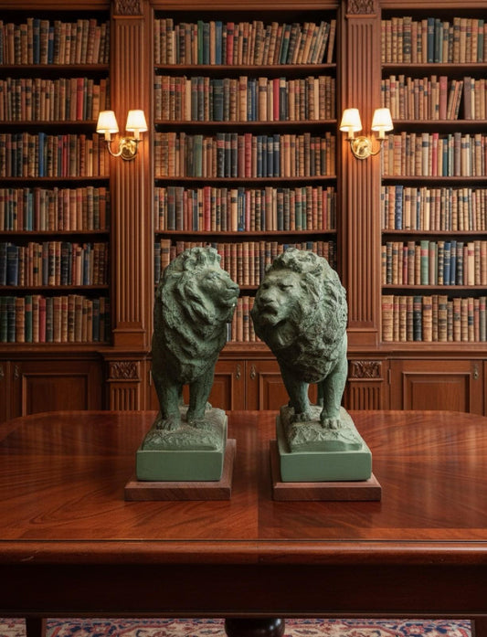 Pair Vintage Bookends Cast Metal Lions Wood Base 9”h Verdigris Finish Opposing