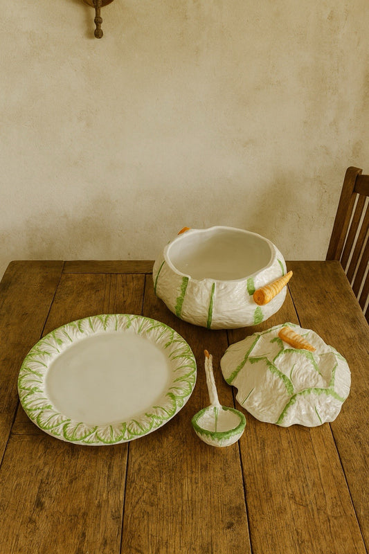 VINTAGE Italian Majolica Cabbage Tureen Set Carrot Handles Platter Ladle RARE