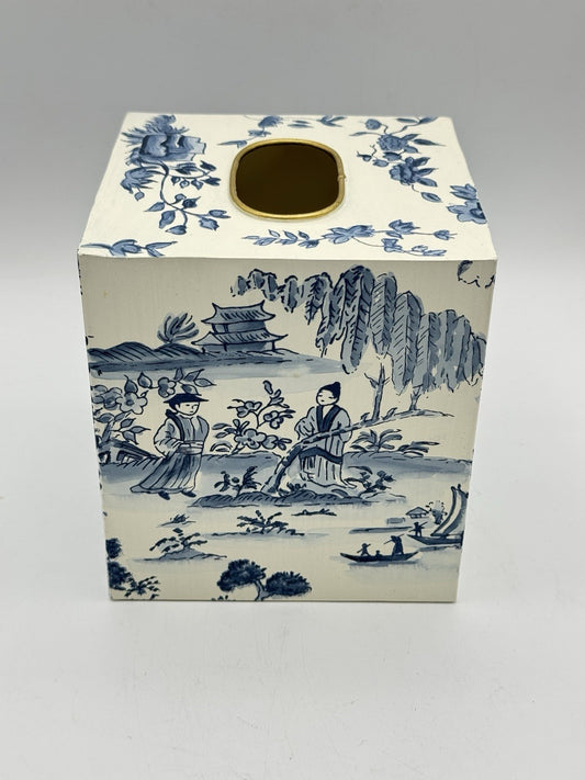 Vintage Metal Chinoiserie Tissue Box Cover – Blue & Cream Scenic Design Toleware