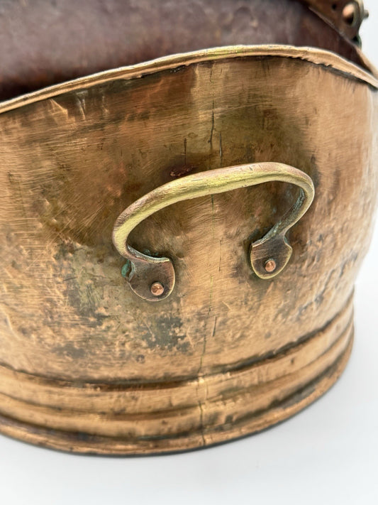 Antique English Copper Coal Scuttle Fireplace Log Bucket with Handle 15”
