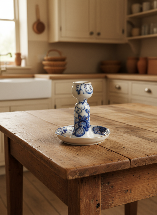 Vintage Russian Porcelain Candlestick Lomonosov Blue White Gold Trim 5”x 4.25”