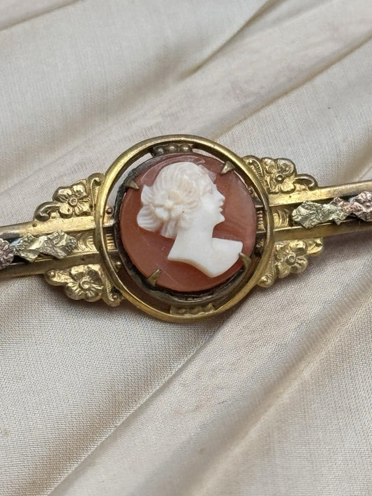 Vintage Cameo Bar Pin 1930s Goldtone Floral 2.5 Inch Brooch