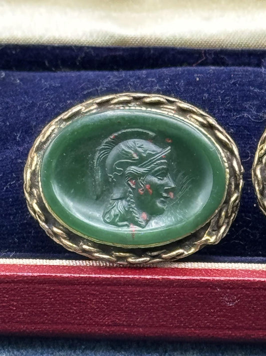 Vintage Cameo Earrings Faux Bloodstone Intaglio Green Goldtone Rope Edge Clips