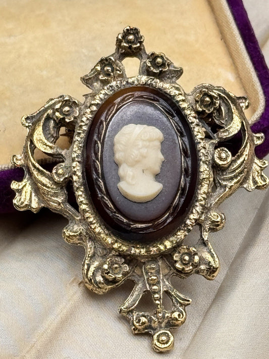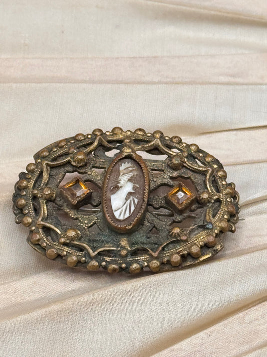 Vintage Cameo Brooch Filigree Brown Rhinestone Victorian Style Goldtone 1.6”