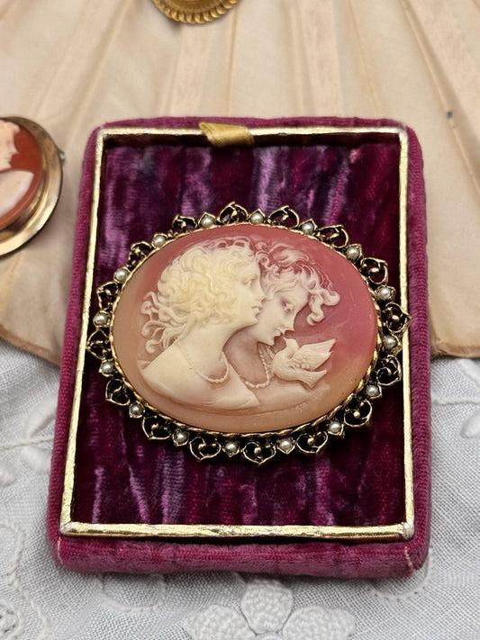 Vintage Goldtone Cameo Brooch Pink Shell Style Lovers Dove Faux Pearl 2.25”