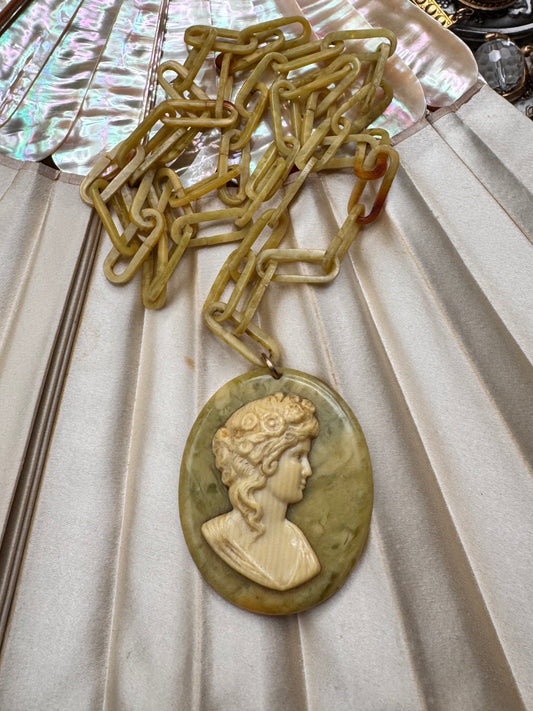 Celluloid Cameo Necklace 26” Chain Vintage Cream Green Pendant 1.75”
