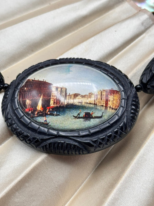 Vintage HOTCAKES Necklace Venice Scene Carved Black RESIN 19” Sterling