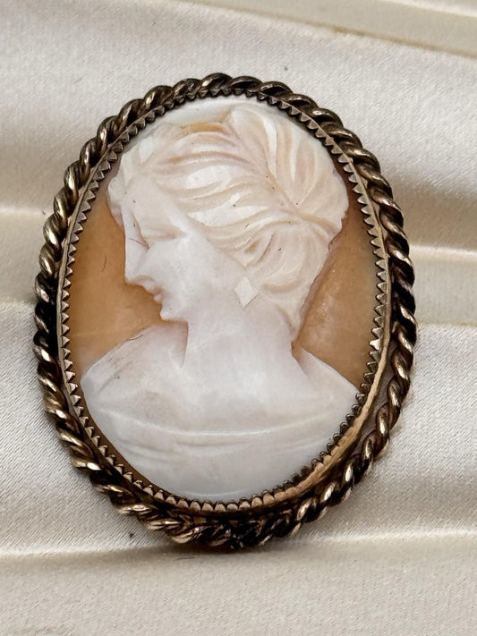 Vintage Goldtone Cameo Brooch Pendant Left Facing Lady Rope Frame