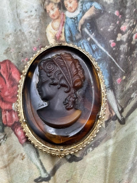 Vintage Goldtone Cameo Brooch Amber Glass Classical Lady Portrait